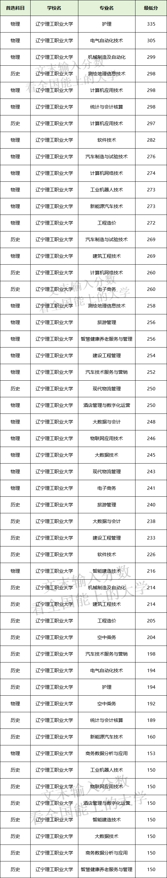 辽宁理工职业大学专科专业最低分数区间在335分-150分,335分对应护理专业,150分对应智慧健康养老服务与管理、商务数据分析与应用、大数据技术等专业。
