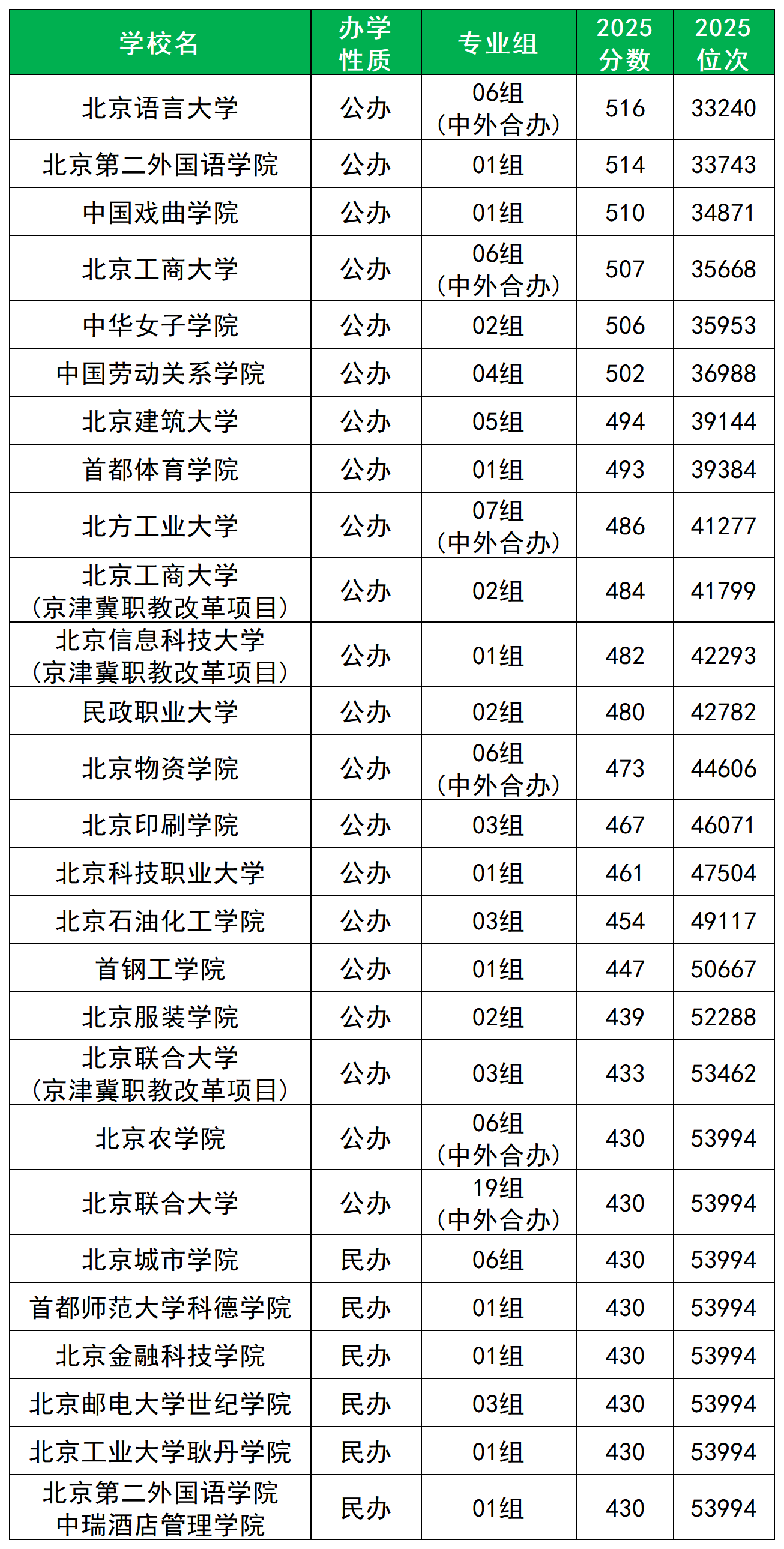 以下为2025年北京市内所有二本大学最低录取分数线: