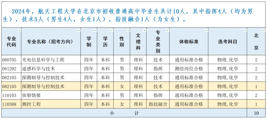 战略支援部队航天工程大学招生简章已公布,2024招生计划422人,其中北京10人,招生专业包括飞行器动力工程、武器发射工程、武器系统与工程、测控工程、雷达工程、探测制导与控制技术等。