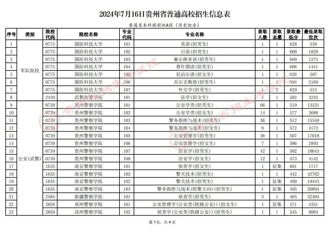 贵州省2024年普通高校招生本科提前批(公安类院校)录取分数线已经公布。在贵州高考本科提前批投档中,警校的投档分数线为: