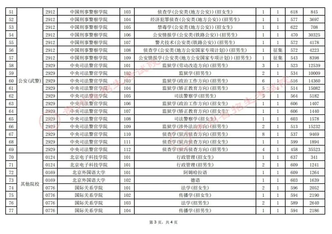 中国人民公安大学,专业组161(国家专项),投档分数线为463分;