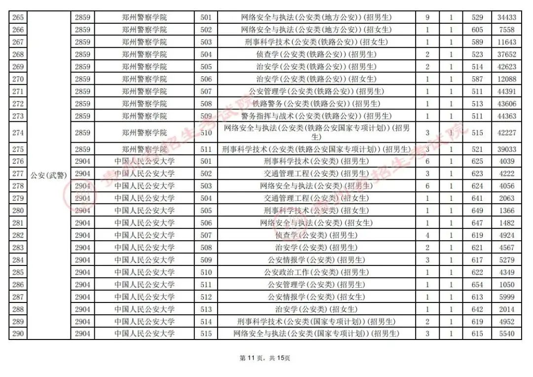 中国人民公安大学,专业组第504组,投档分数线为627分;