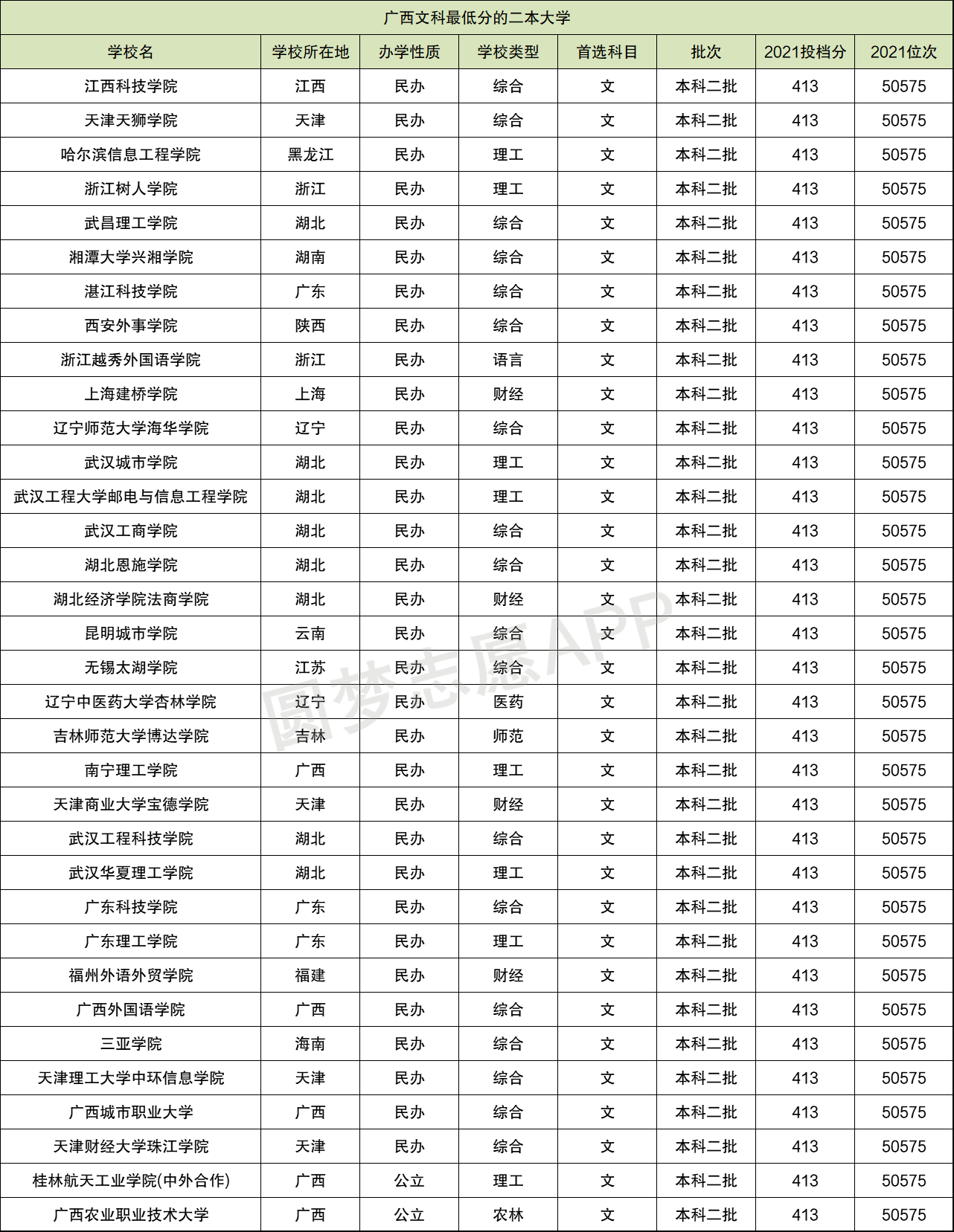 2021年广西文科的二本批次线为413分,而最低分数线413分的院校一共有34所,其中公办院校有2所,民办院校有32所,虽然有擦线的公办院校,但是一般来说院校最低的分数线是最为冷门专业的最低分数线,如果对专业不太在意的考生们可以考虑擦线的二本院校。
