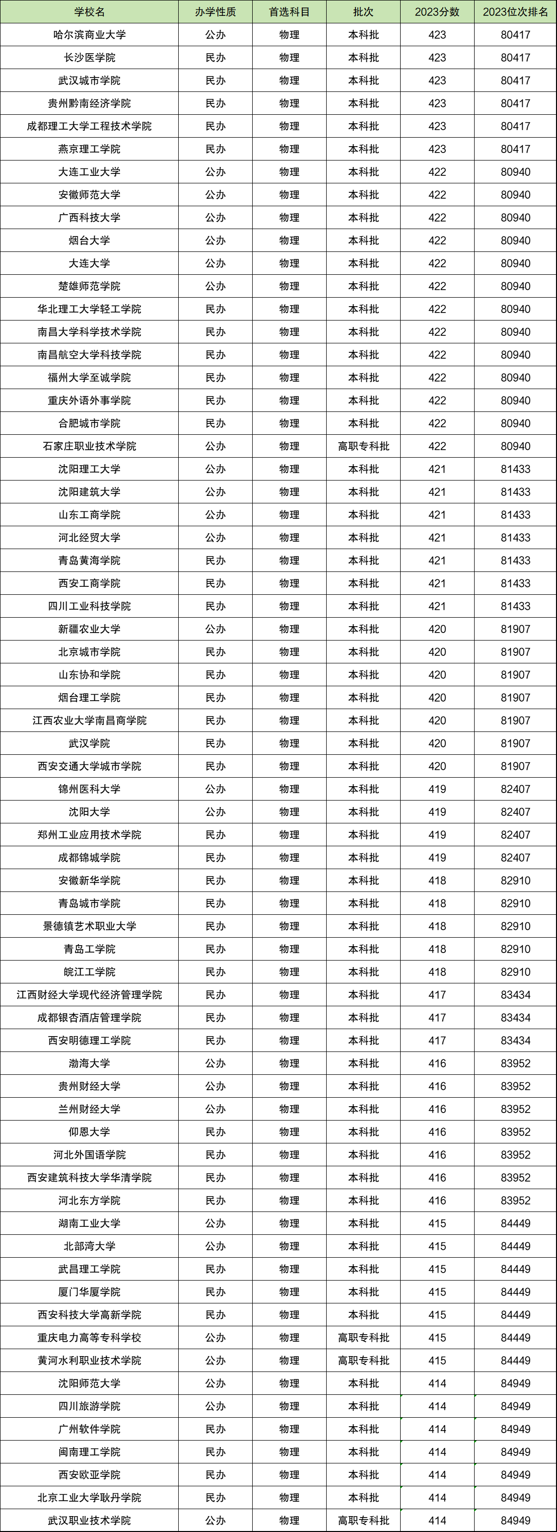 在8万-8.5万位的范围内,最高位次对应的大学是哈尔滨商业大学、长沙医学院等6所,最低录取位次为80417位,位次对应分数为423分;