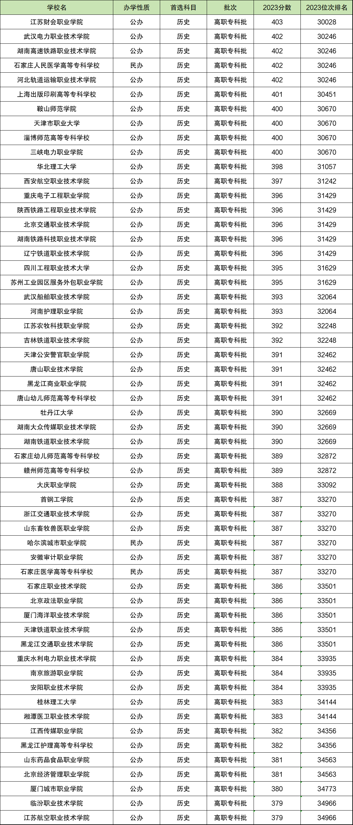 3万-3.5万位中,最低位次对应的大学是江苏航空职业技术学院、临汾职业技术学院,最低录取位次为34966位,位次对应分数为376分;