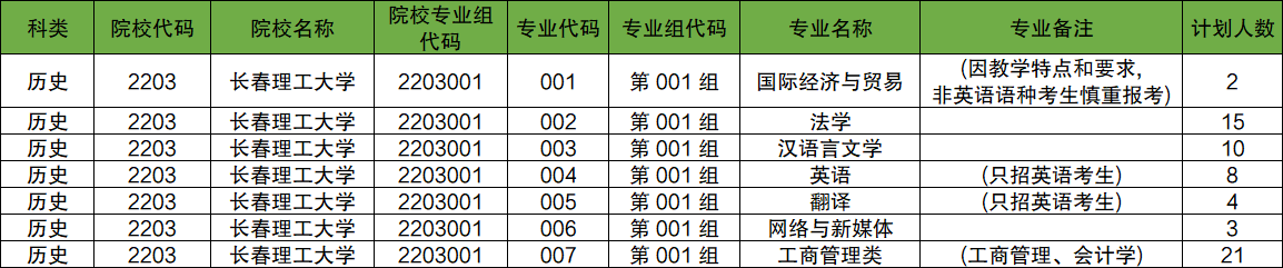 第001组:专业组代码为2203001,包含专业有国际经济与贸易、法学、汉语言文学、英语、翻译、网络与新媒体、工商管理类。