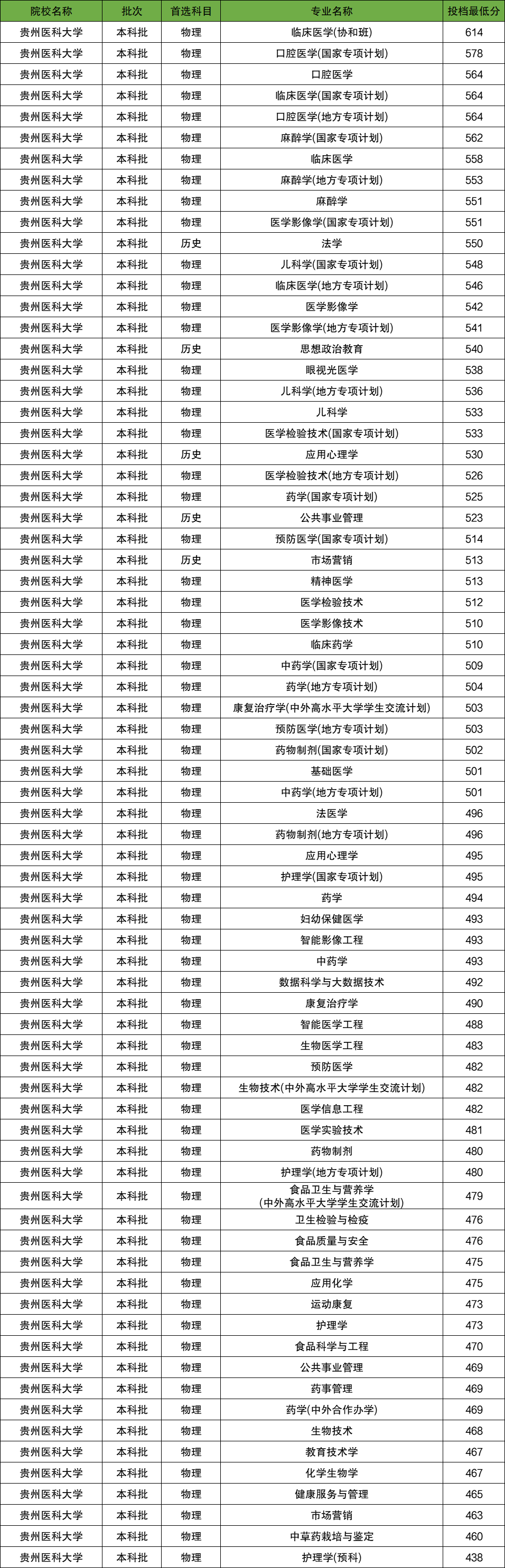2025年贵州医科大学在省内招生最低分数范围为438分-614分,各科类最低分详情如下: