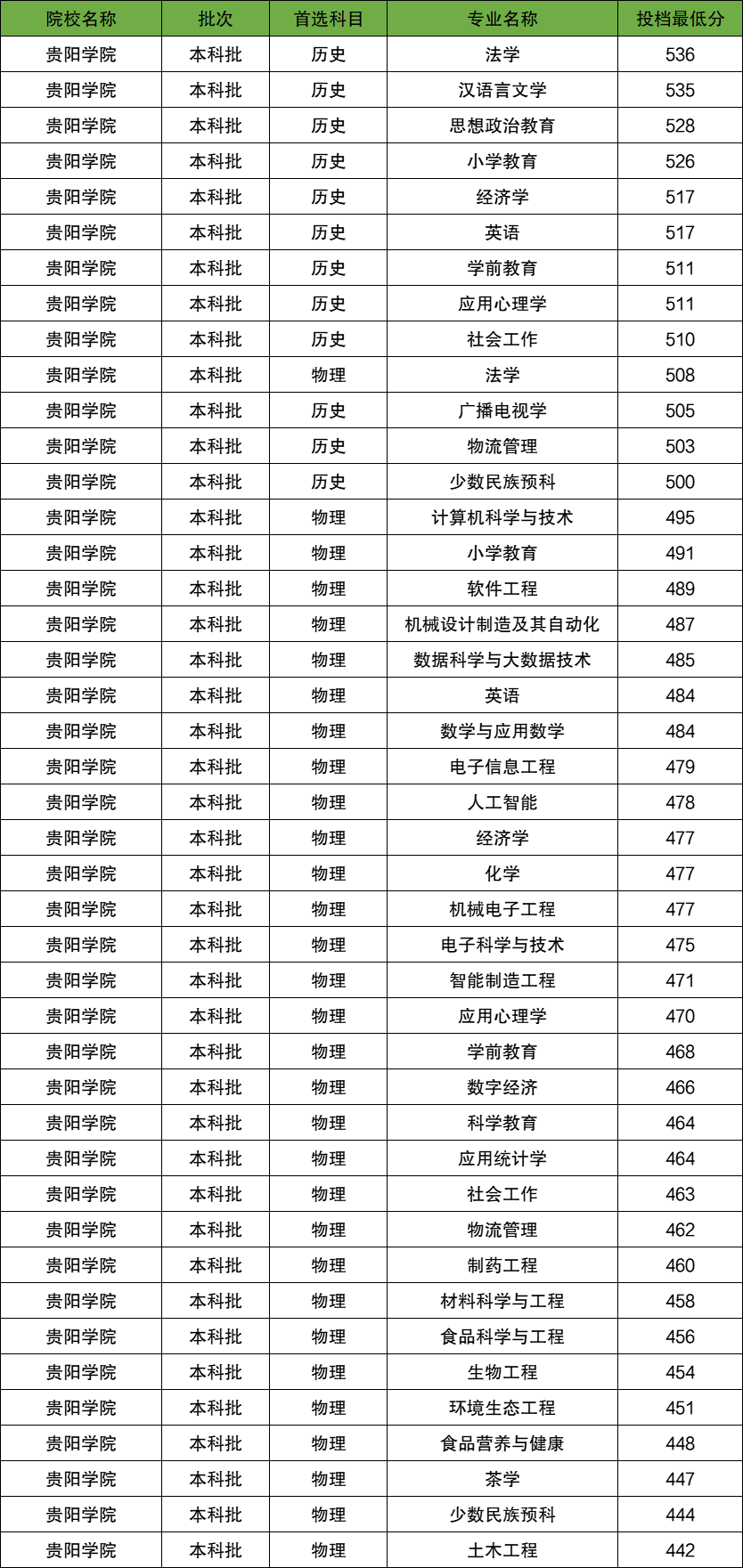 2025年贵阳学院在省内招生最低分数范围为442分-536分,各科类最低分详情如下:
