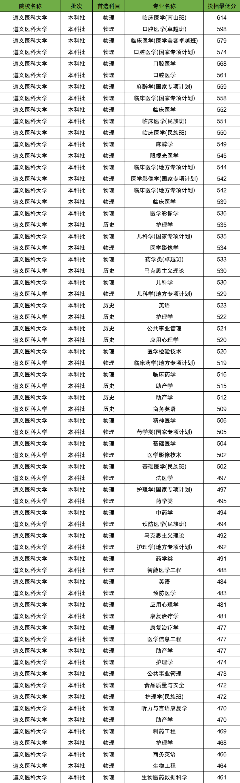 2025年遵义医科大学在省内招生最低分数范围为461分-614分,各科类最低分详情如下: