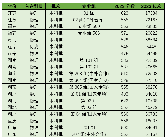 2023年中国医科大学在辽宁省内历史类的最低录取分数线为546分,物理类的最低录取分数线为476分。在省外高考实行3+1+2模式的地区中都是在物理类录取,录取分数最高的是在江苏专业组01组,录取分数为623分;分数超过600分还有湖北专业组第02组,分数为622分;录取分数最低的是湖北专业组第01组(国家专项),分数为493分。