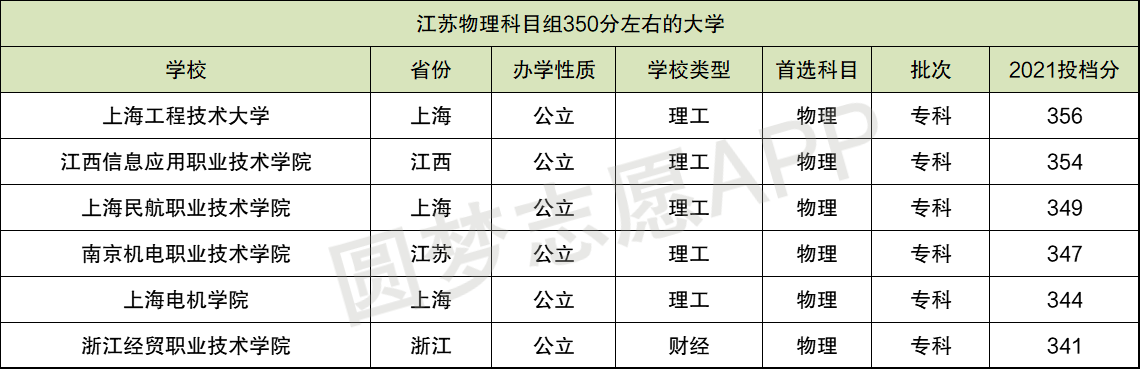 2021年江苏物理科目组的本科批次线为417分,所以350分也是只能上专科院校,2021年江苏物理科目组350分左右的大学一共有6所,均为公办大学,这还是数量较少,小编采取的上下十分的院校的结果,如果只算上下五分的院校的的话,一共只有3所,小编同样为大家推荐两所实力较好的院校。