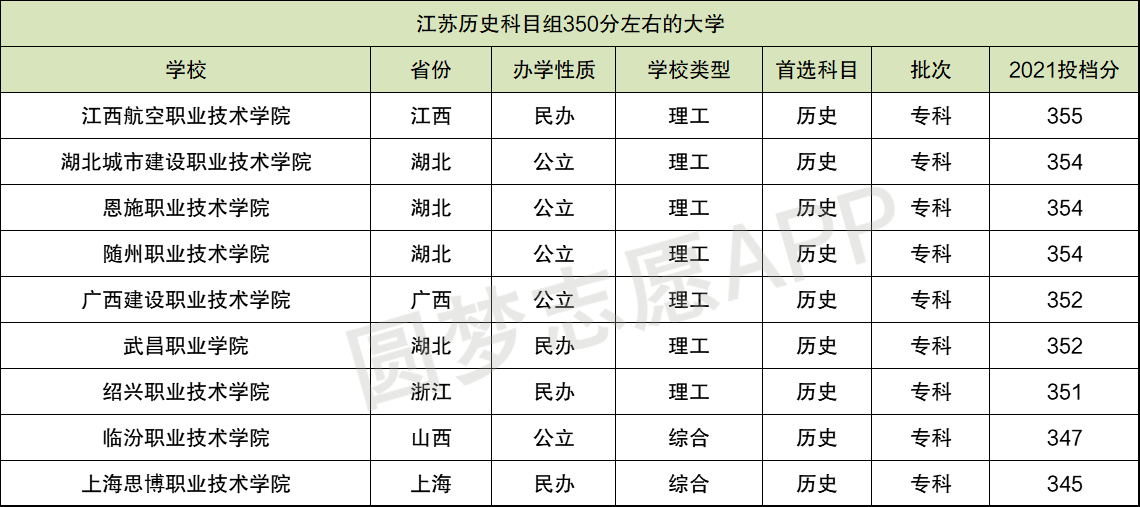 2021年江苏历史科目组的本科批次线为476分,所以350分也是只能上专科院校,2021年江苏历史科目组350分左右的大学一共有9所,对于江苏历史科目组的考生来说,350分确实分数比较低,所以能上的大学公办院校和民办院校比例相差不大,一共有5所公办专科院校、4所民办专科院校,小编就为大家推荐两所实力较好的院校。