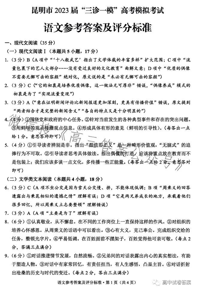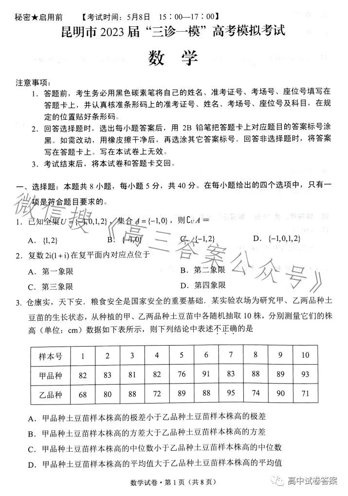 下文为三诊一模2023昆明高三市三统各科试卷及答案汇总: