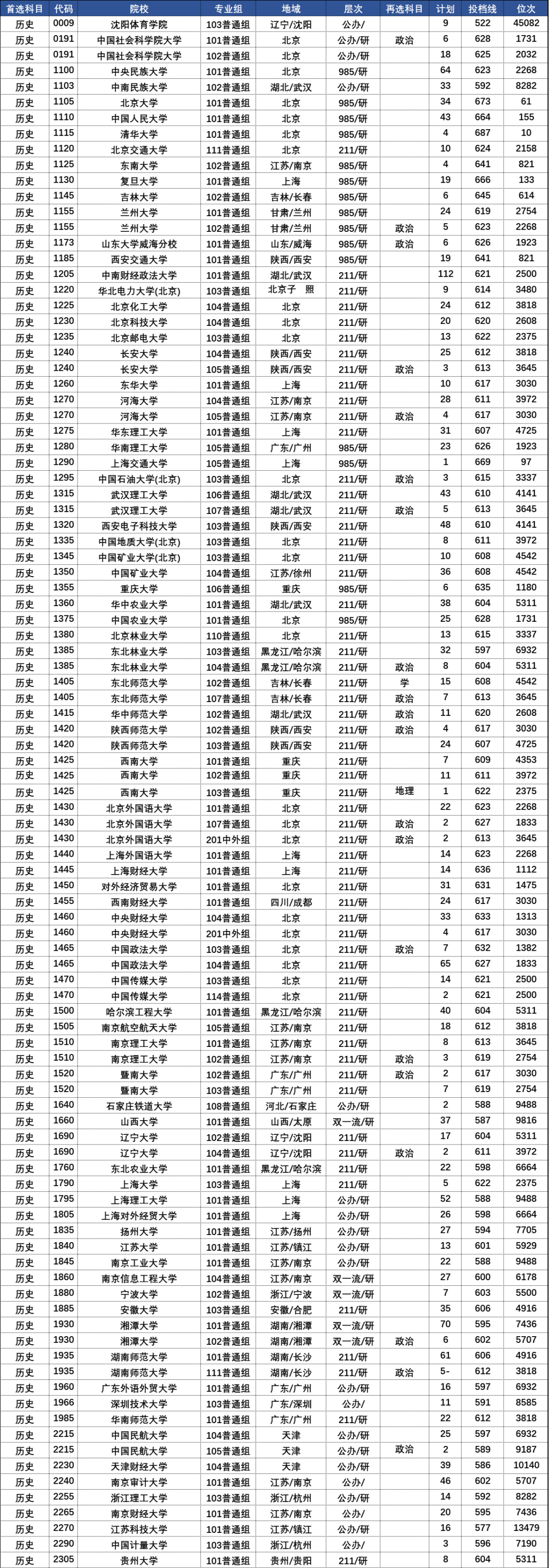 下面为全国部分高校在河南历史类录取分数线排名名单: