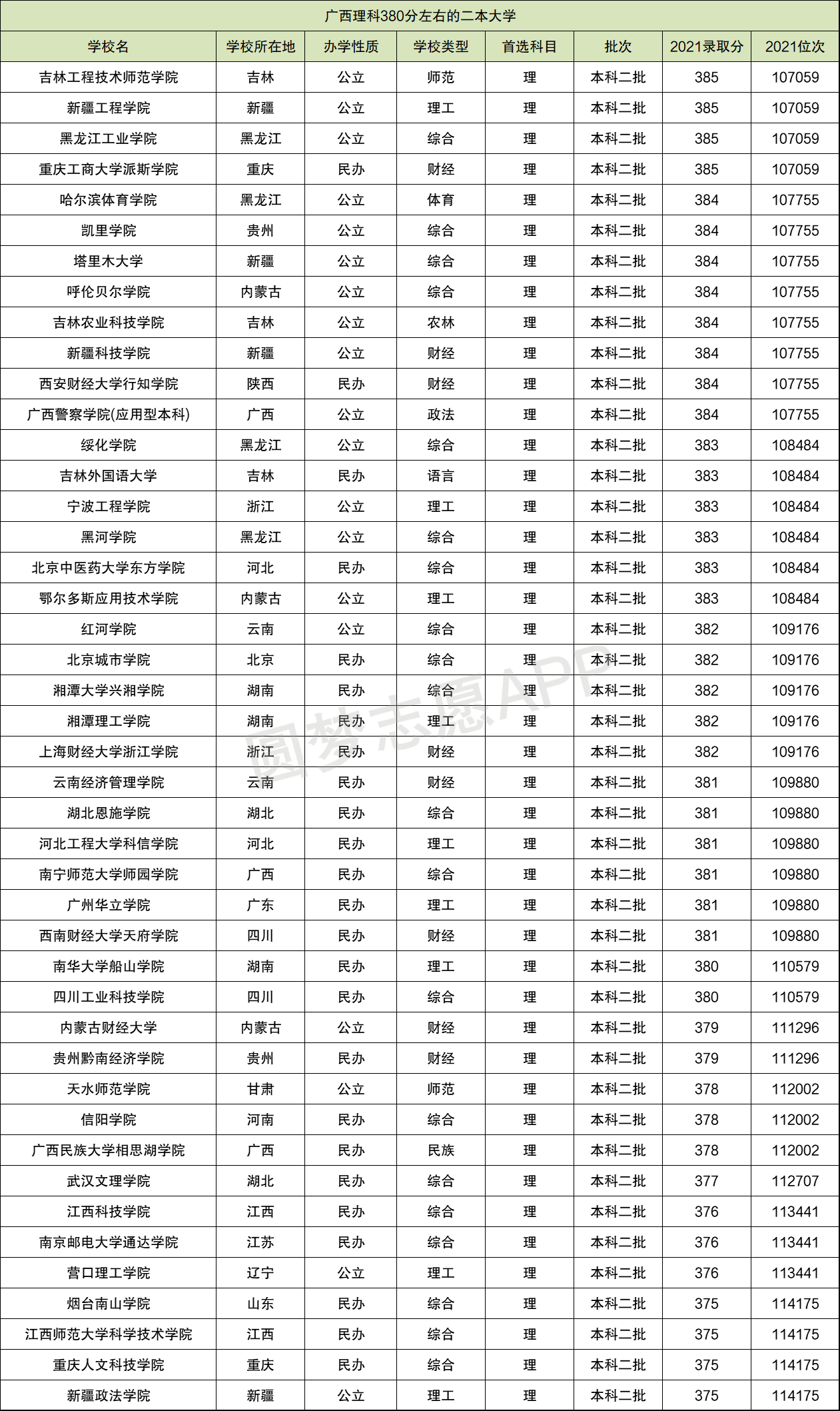 由于每所院校在每个省份的录取情况都不一样,所以形成的录取分数线都不相同,且380分在很多省份都不能上二本大学,小编就以广西为例,根据广西教育考试院公布的2021年招录数据,为大家整理出广西理科380分左右的二本大学,供2022年考生参考。