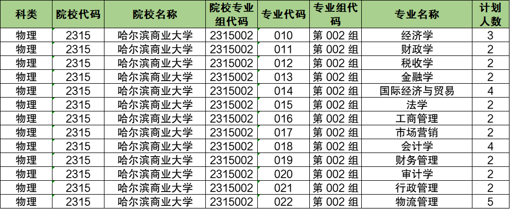 第002组:专业组代码为2315002,包含专业经济学、财政学、税收学、金融学、国际经济与贸易、法学、工商管理、市场营销、会计学、财务管理、审计学、行政管理、物流管理。