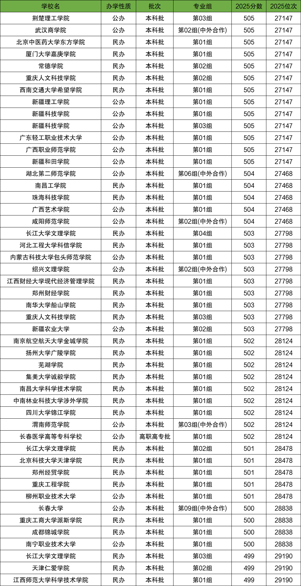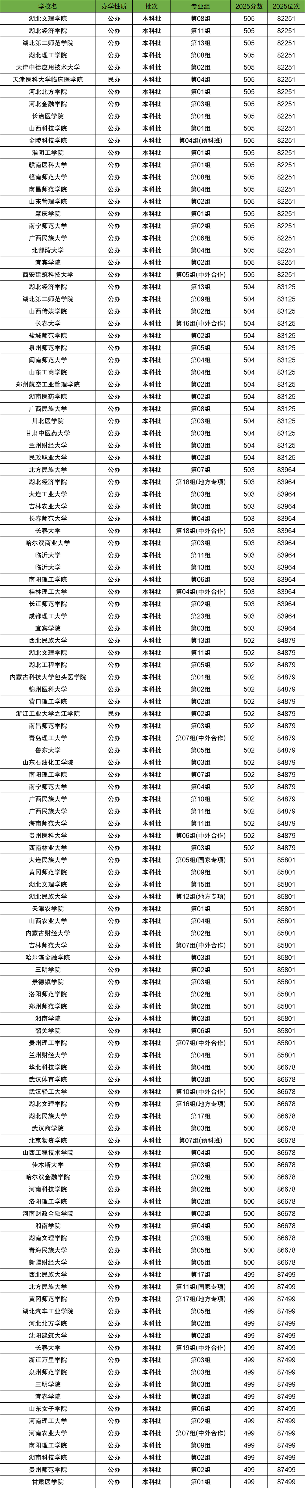 在所有大学中收分较高的大学为湖北文理学院第08组,2025年最低投档分为505分;收分较低的大学为甘肃医学院第01组,2025年最低投档分为499分。
