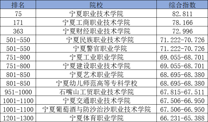 宁夏大专院校排名如下:宁夏职业技术学院(全国第75名)、宁夏工商职业技术学院(全国第171名)、宁夏财经职业技术学院(全国第363名)等。