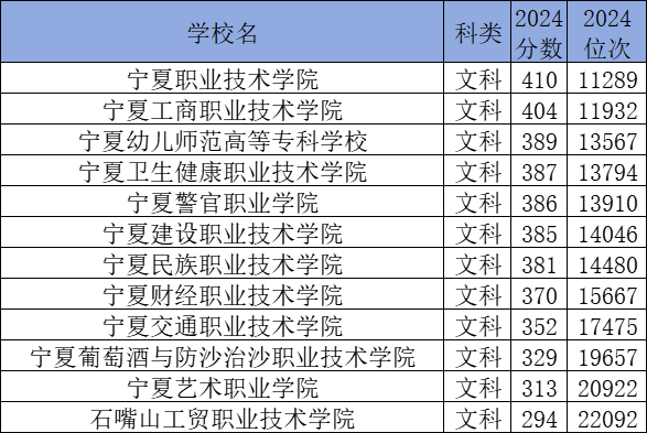 2024年宁夏理科大专院校录取分数线范围在232分~363分之间,宁夏文科大专院校录取分数线范围在294分~410分之间。