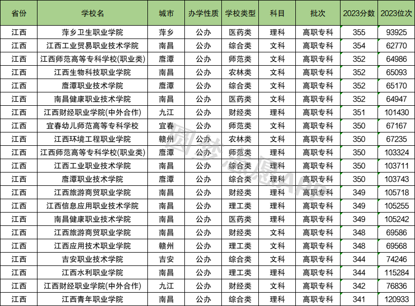 在江西省340分-355分的考生只能上专科学校,江西省内理科生能选择的大学有10所,文科生能选择的为11所,均为公办学校。