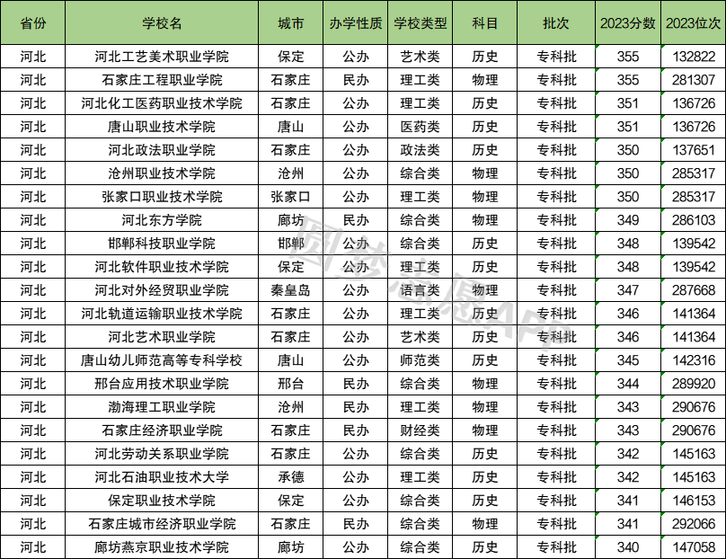 在河北省340分-355分的考生只能上专科学校,河北省内历史类能选择的大学有13所,物理类能选择的有9所,大部分为公办学校。
