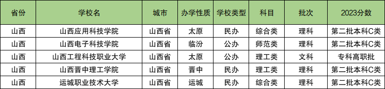 在山西省340分-355分的中,理科生有四所民办本科学校可供选择,其余文理科均为专科学校。