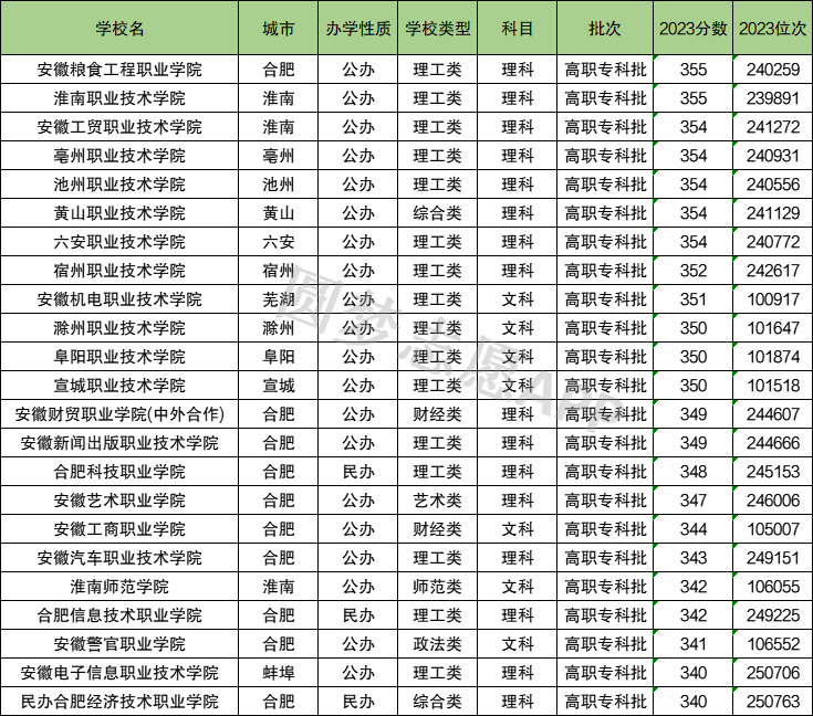 在安徽省340分-355分的考生只能上专科学校,安徽省内,文科生能选择的大学有7所,理科生能选择的有16所,除合肥科技职业学院、合肥信息技术职业学院、民办合肥经济技术职业学院均为公办大学。