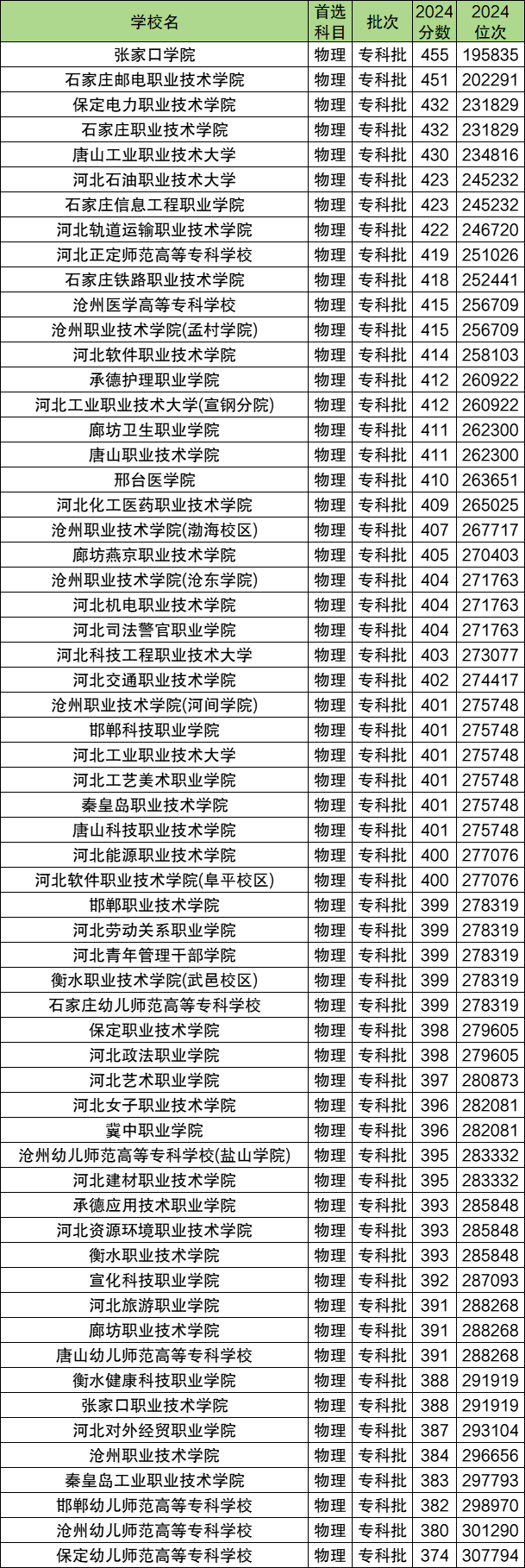 下图为2024年河北省所有专科物理类分数线,从图片数据可知,2025届河北物理组考生想上省内公办大专,最低需要374分,超专科线174分。