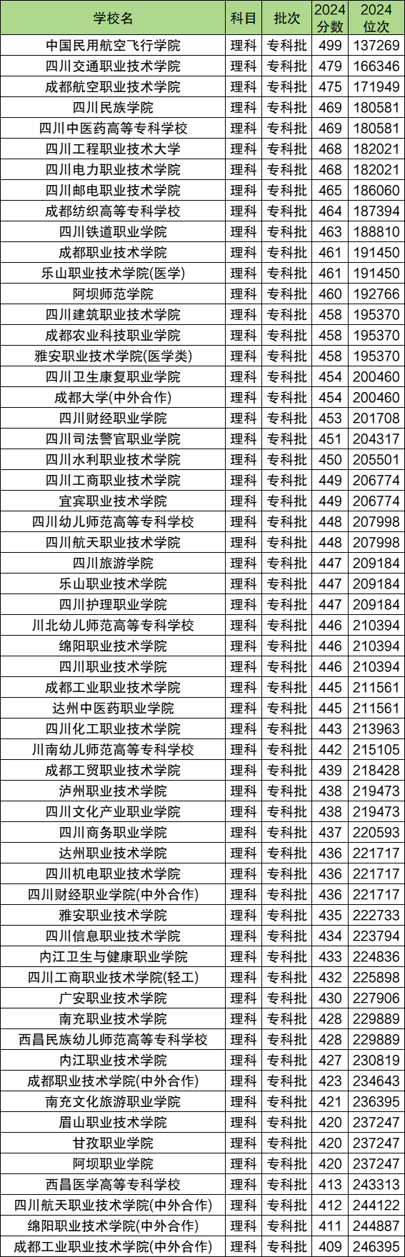 下图为2024年四川省所有专科理科分数线,从图片数据可知,2025届四川理科考生想上省内公办大专,最低需要409分,超专科线259分。
