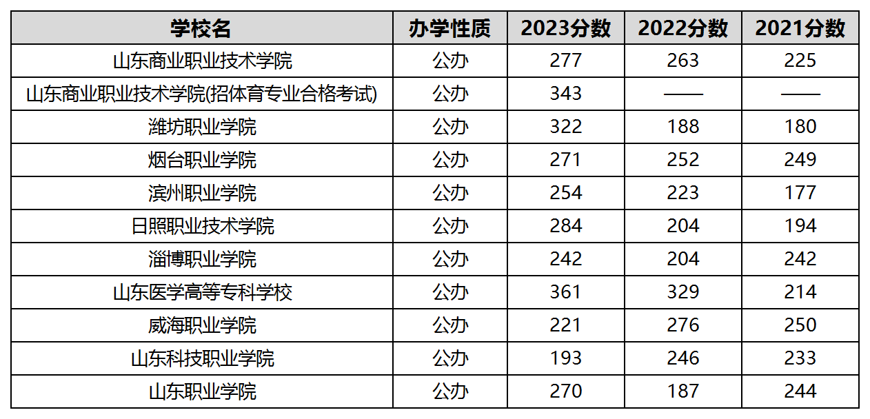 我们一起来看看上述十所排名最高的公办专科高职院校2023年在山东省本省的招生分数线: