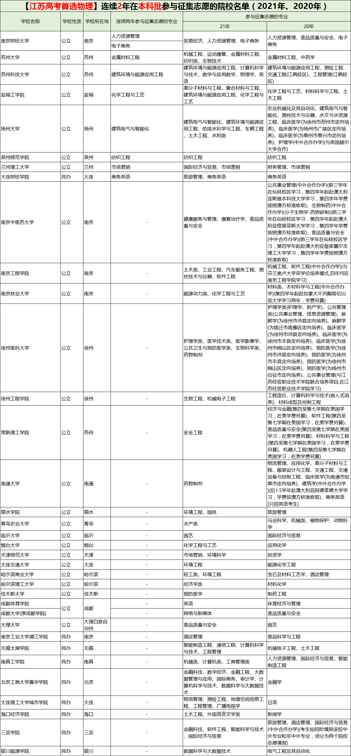 以下为2021年、2020年江苏省连续两年参加本科征集志愿的大学,各位同学连同2022年征集志愿名单一同参考,查看江苏省连续三年参加征集志愿的本科大学有哪些。