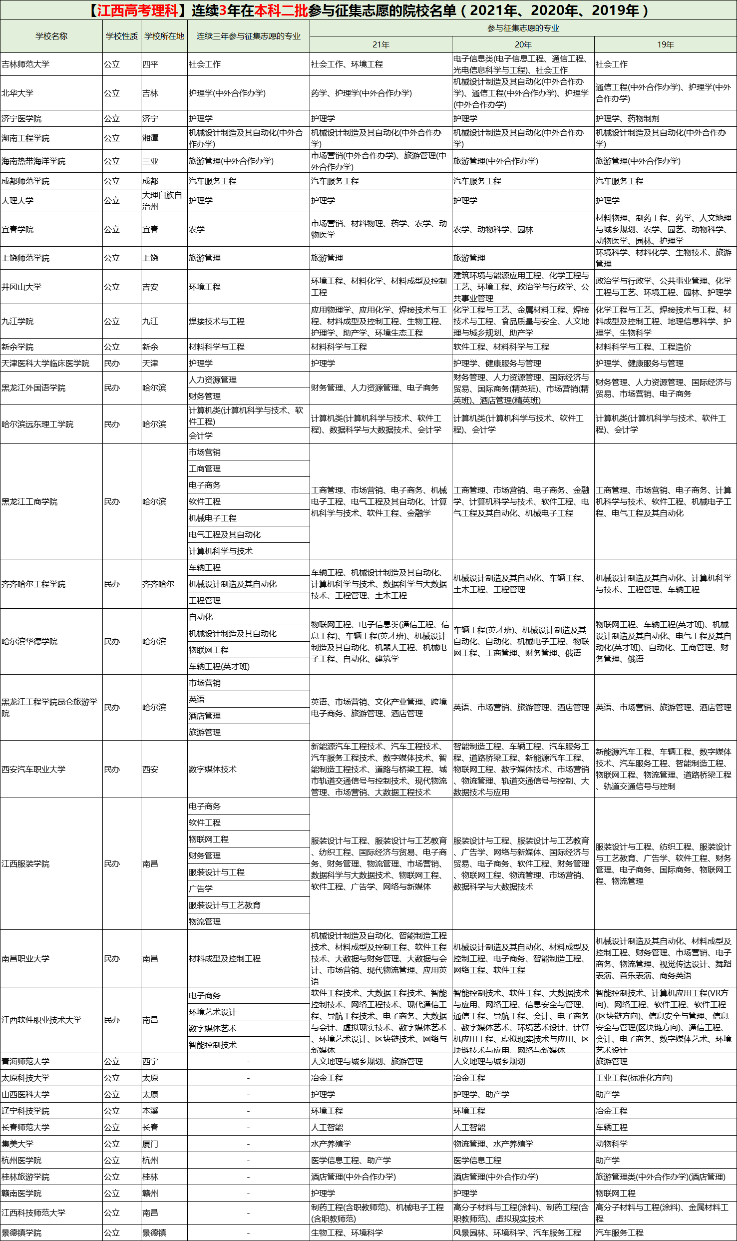 江西省连续两年参加征集志愿的大学理科:黑龙江工商学院、齐齐哈尔工程学院、哈尔滨华德学院、黑龙江工程学院昆仑旅游学院、西安汽车职业大学、江西服装学院、南昌职业大学、江西软件职业技术大学、青海师范大学、太原科技大学等34所大学。