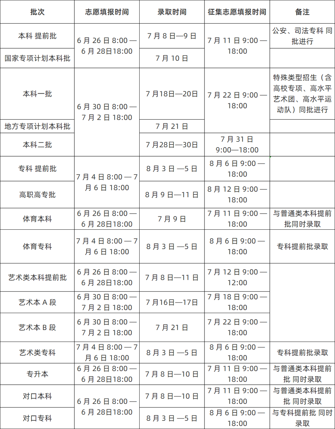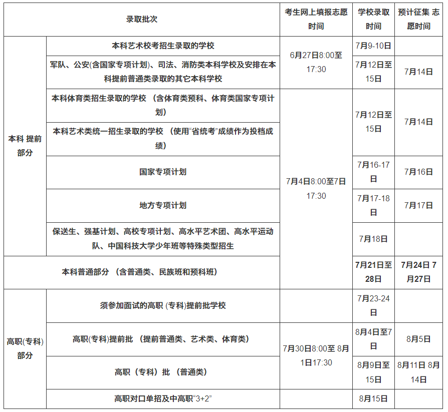 7月17日-19日:文史、理工类地方专项计划、特殊类型招生本科院校(含自主招生、高水平艺术团、高水平运动队、高校专项计划招生)