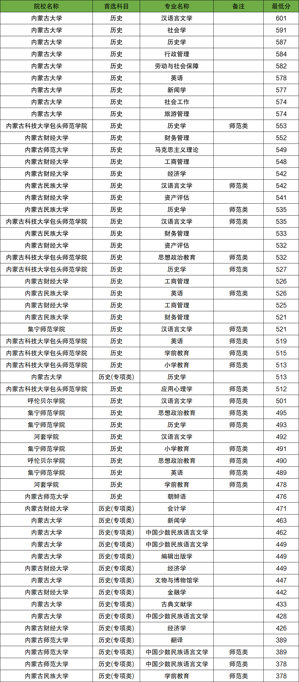 2025年在内蒙古招收历史类考生的地方专项计划大学有8所,共招生404人,所有大学最低分数线区间为378分-512分,也就是在内蒙古历史类最低378分就能上地方专项计划。