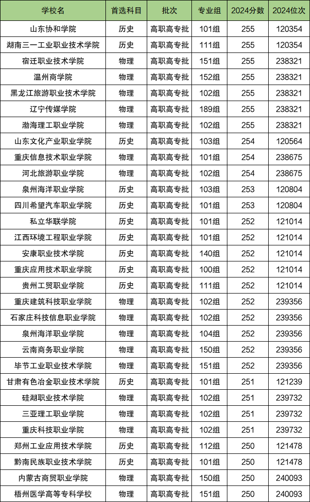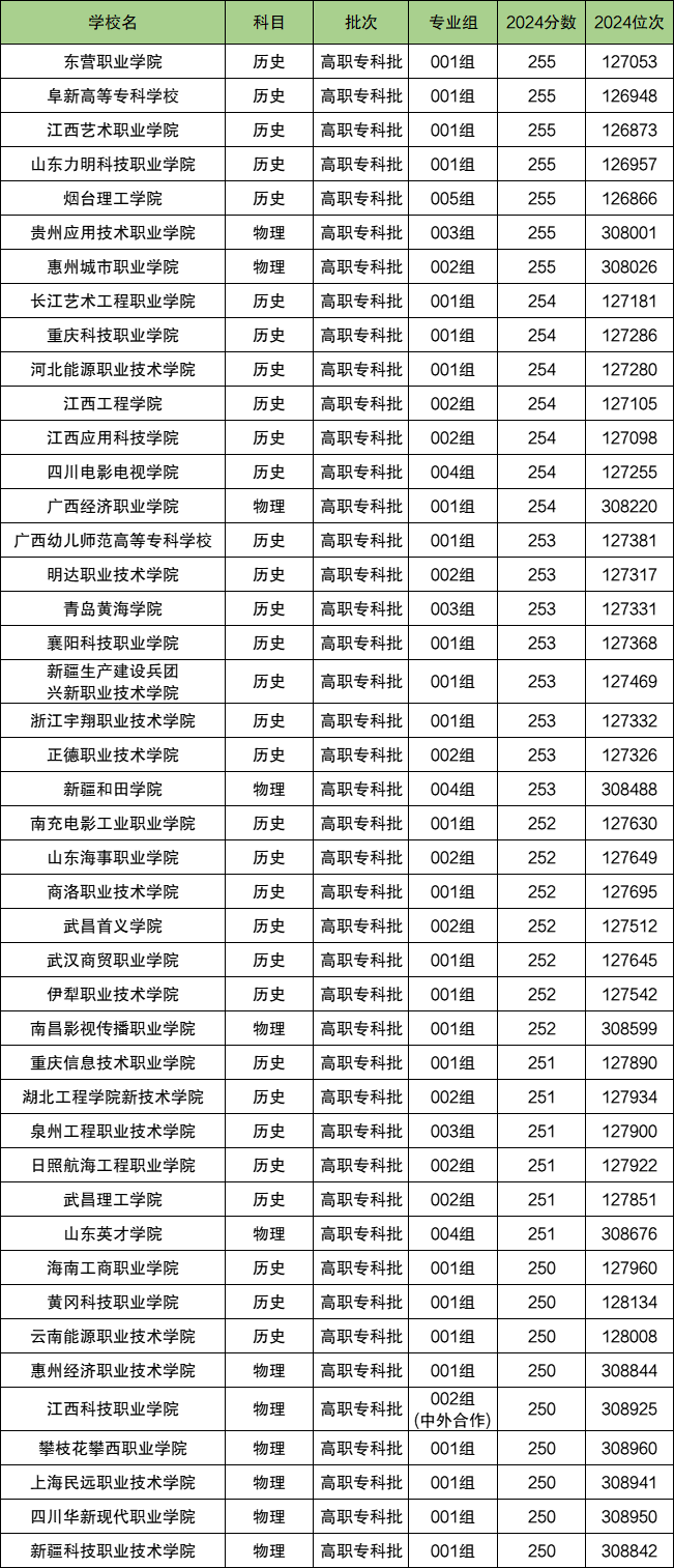 物理组分数线在250分左右的大学及专业组:贵州应用技术职业学院003组(255分)、广西经济职业学院001组(254分)、南昌影视传播职业学院001组(252分)等。