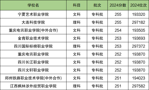 四川高考250分左右不管是文科生还是理科生,都可以上专科大学。可以上的省内院校:文科是四川长江职业学院252分、四川文轩职业学院252分;理科是四川国际标榜职业学院253分。