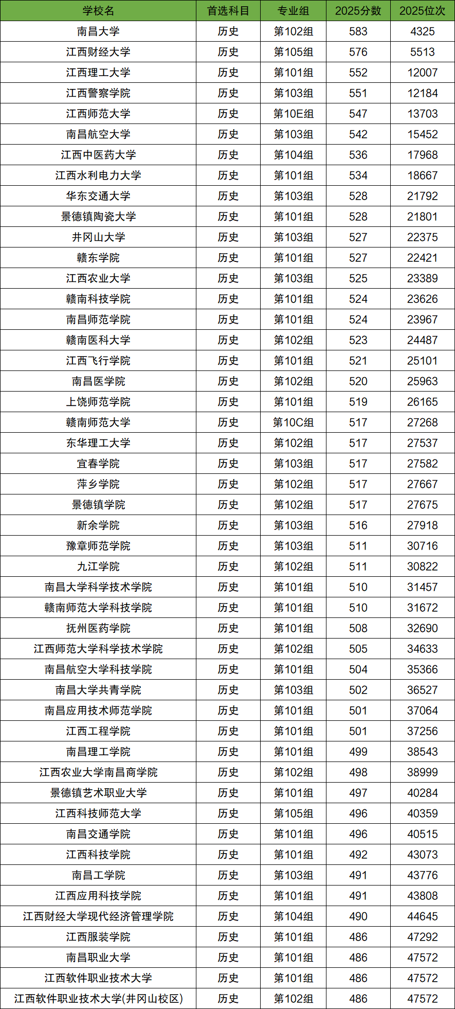 2025年高考江西省内本科大学历史类录取分数线范围在486分~583分之间,其中录取分数线最高的是南昌大学,2025年最低投档线是583分,对应投档位次为4325名。
