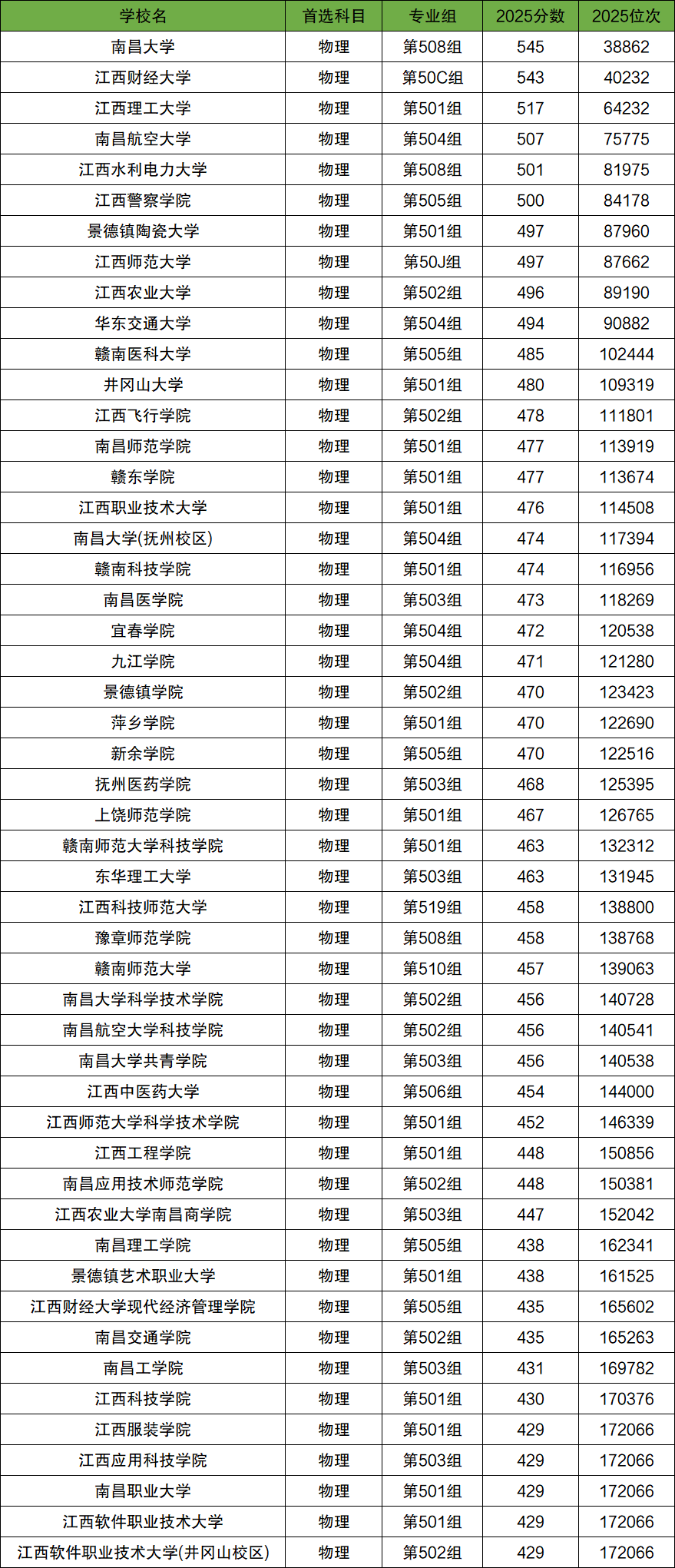 本文数据来自江西教育考试院发布的2025普通类本科批投档文件,文章仅收集了江西省内本科院校分数。