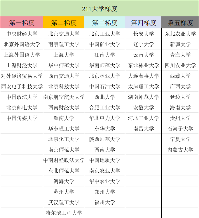 中国211大学一共可以划分为5个梯队,第一梯队的211大学有中央财经大学、中国政法大学、北京邮电大学等院校;第二梯队的211大学有上海大学、南京理工大学、西南交通大学,本文将为大家带来各梯队211大学名单及分数线。