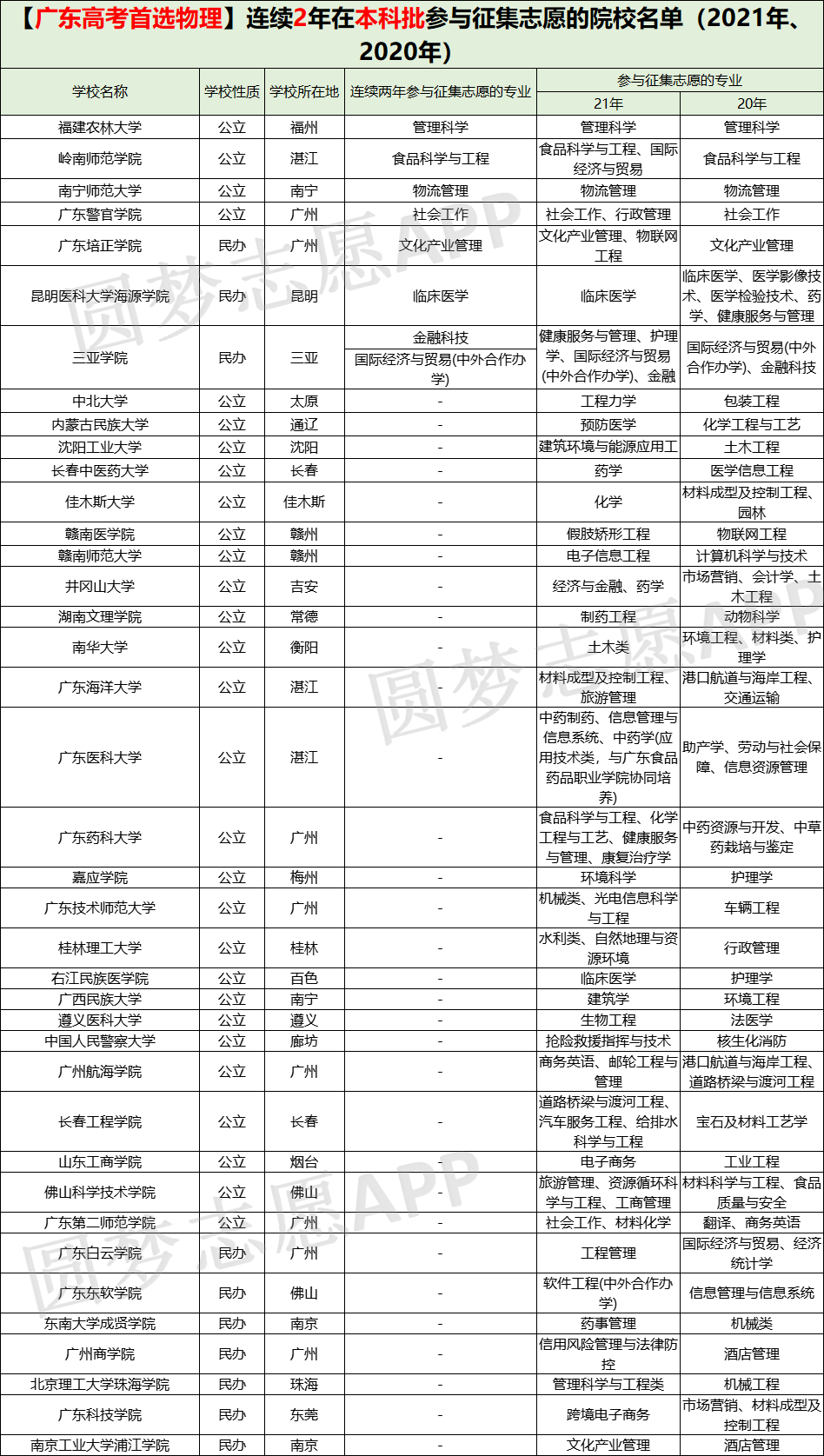 广东省连续两年参加征集志愿的大学物理:福建农林大学、岭南师范学院、南宁师范大学、广东警官学院、广东培正学院、三亚学院、中北大学、内蒙古民族大学、沈阳工业大学等39所大学。