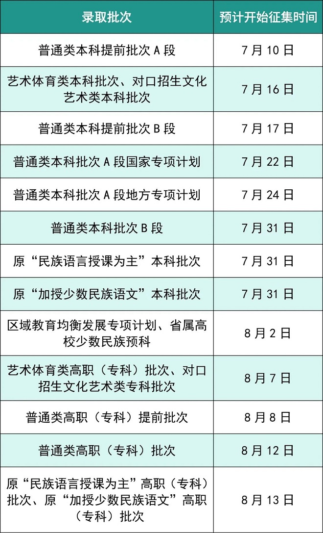 广西:高职专科批第一次征集时间8月13日18:30-8月14日9:00、第二次征集时间8月16日18:30-8月17日9:00。