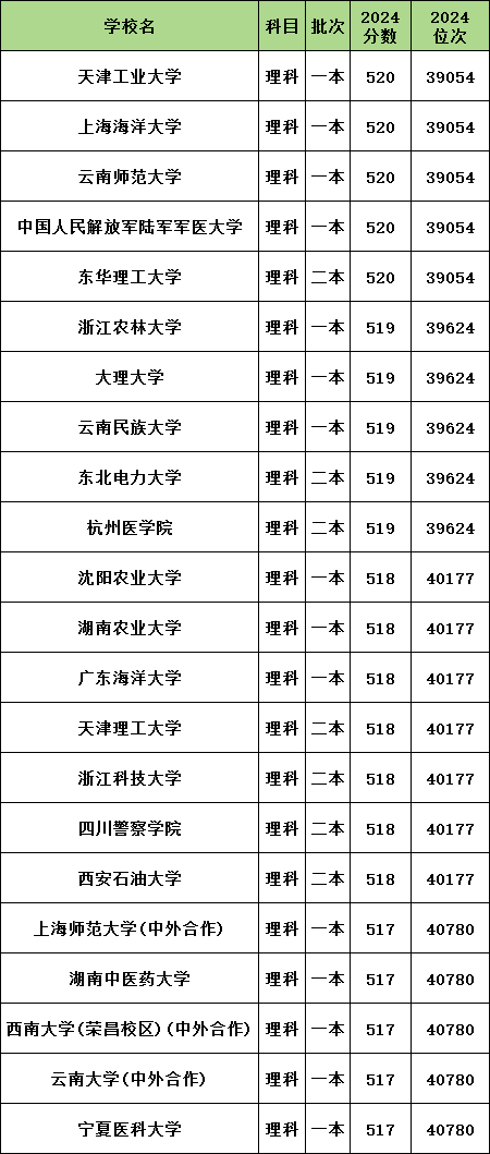 云南高考理科4万名左右能报考的大学中位次排名较低的有上海师范大学(中外合作)、湖南中医药大学、西南大学(荣昌校区)(中外合作)、云南大学(中外合作)等,2024年最低分517分,对应排名是40780名。另外最接近4万名的是沈阳农业大学、湖南农业大学、广东海洋大学、天津理工大学等,2024年最低分518分,排名是40177名。