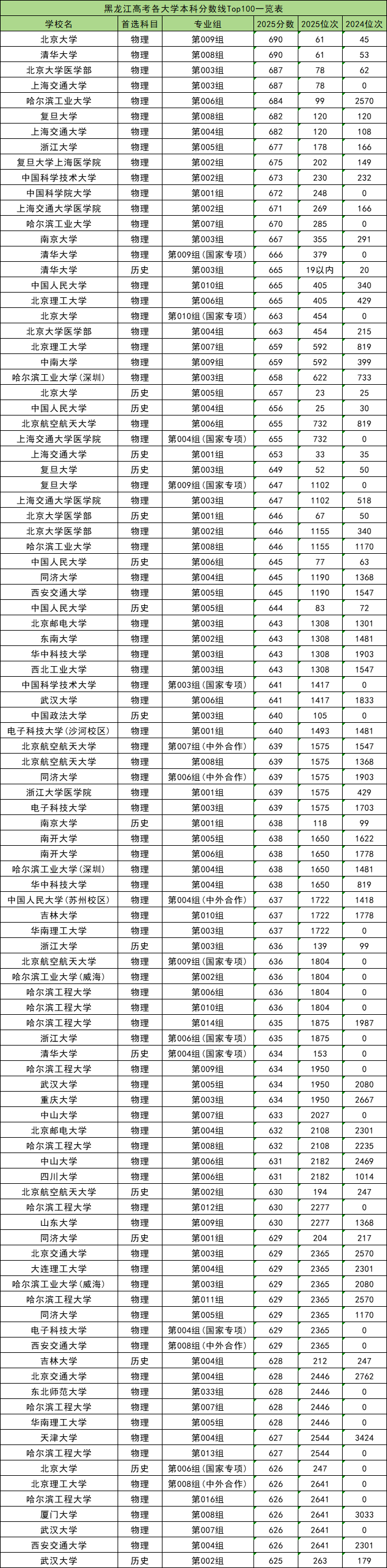上述列举均为2025年黑龙江本科投档录取分数线最低的大学,适合2026届低分考生捡漏。而高分院校中,北京大学第009组以690分的高分占据物理类高分榜第一,清华大学第003组以665分的高分占据历史类高分榜第一。