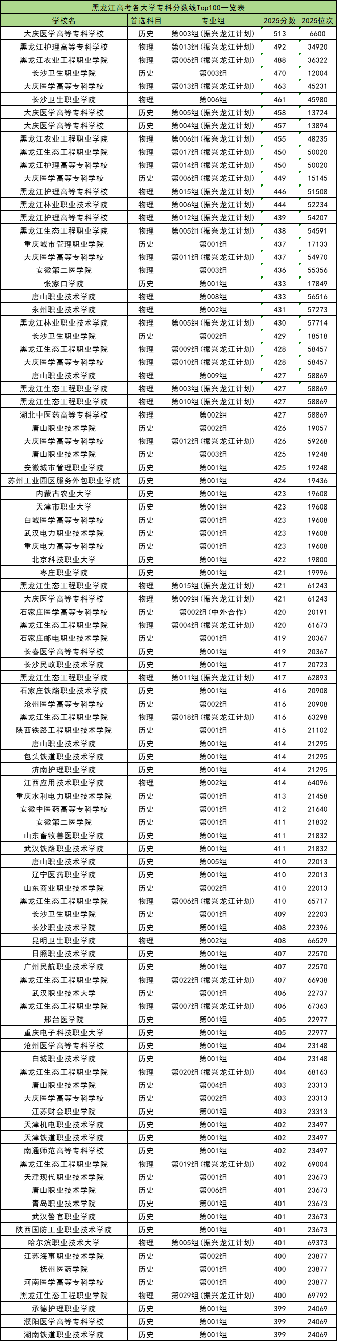 上述列举均为2025年黑龙江专科投档录取分数线最低的大学,适合2026届低分考生捡漏。而高分院校中,大庆医学高等专科学校第003组(振兴龙江计划)以513分的高分占据历史类高分榜第一,黑龙江护理高等专科学校第013组(振兴龙江计划)以492分的高分占据物理类高分榜第一。