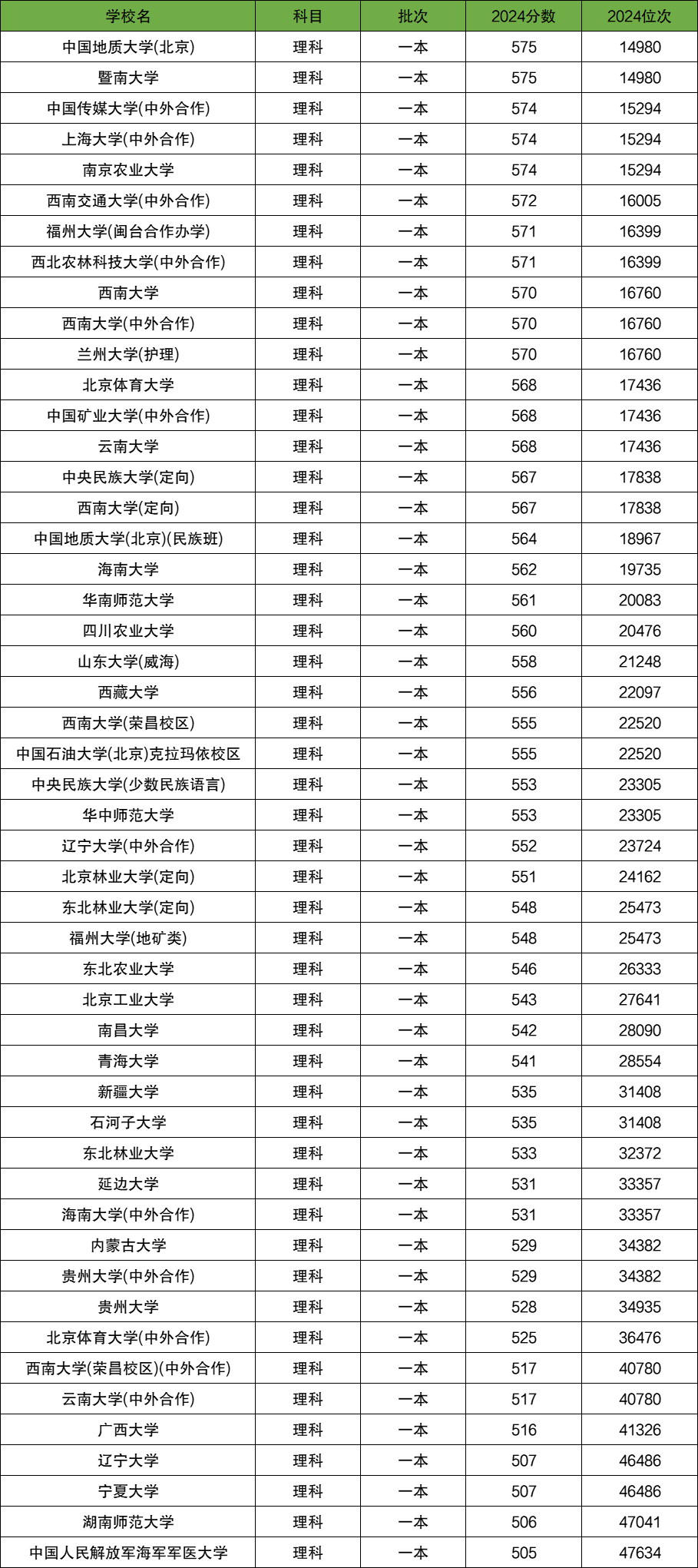 2024年云南省理科一本线为505分。云南理科考生超过一本线70分在全国内能上的211大学有中国地质大学(北京)、暨南大学、中国传媒大学(中外合作)、上海大学(中外合作)、南京农业大学等。
