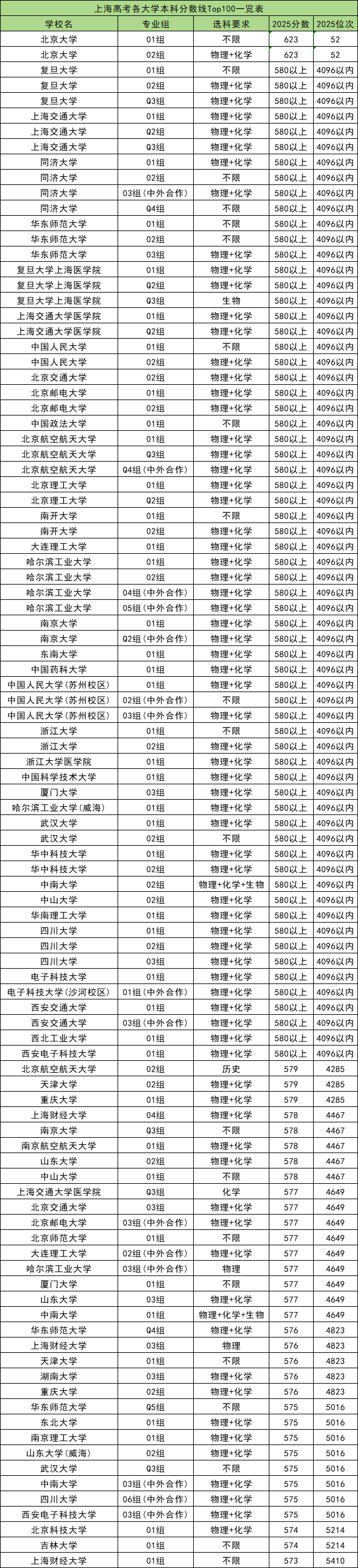 上述列举均为2025年上海本科投档录取分数线最低的大学,适合2026届低分考生捡漏。而高分院校中,北京大学01组以623分的高分占据高分榜第一。