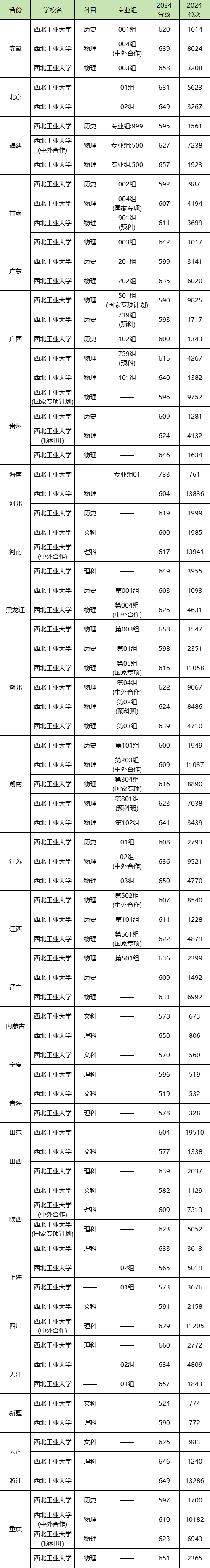 2024年西北工业大学在各地区本科提前批的录取分数线如下: