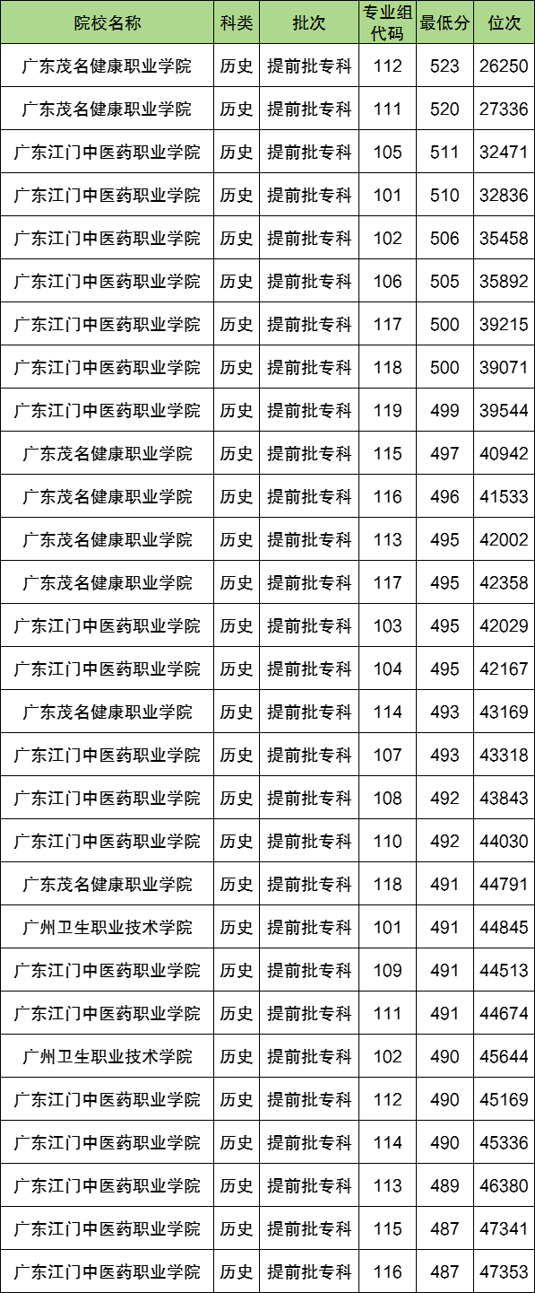 历史类分数线最高、最难考的是广东茂名健康职业学院,2024年最低分523,对应位次26250名。