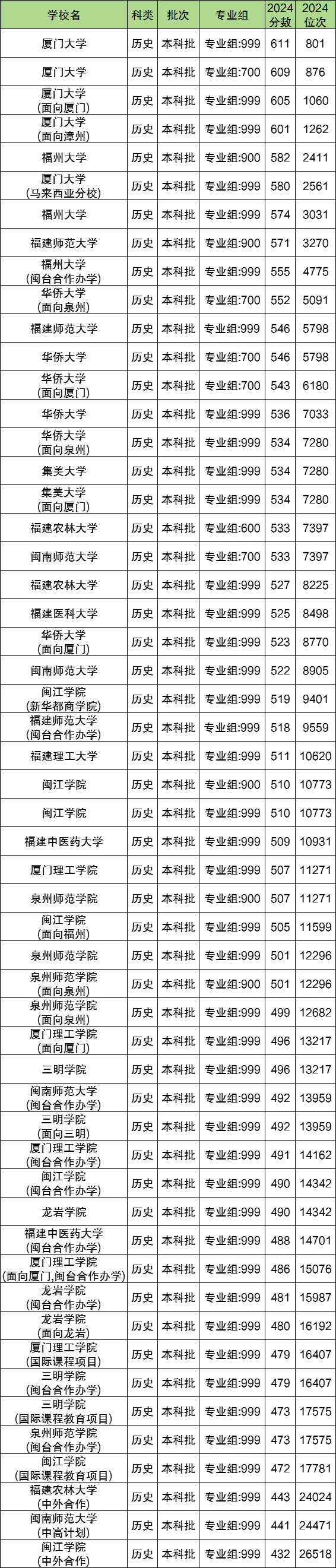 2024年在福建省历史类科目录取中,收分最高的大学为厦门大学专业组:999,2024年最低分为611分,最低位次为801名;其次是福州大学专业组:900,2024年最低分为582分,最低位次为2411名。