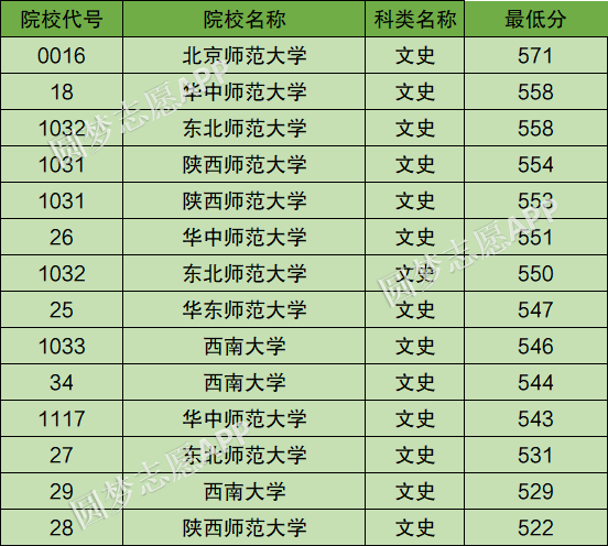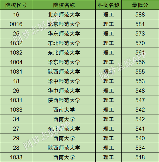 东北师范大学:531分、陕西师范大学:522分、西南大学:529分、华中师范大学:543分、华东师范大学:547分、北京师范大学 :571分。
